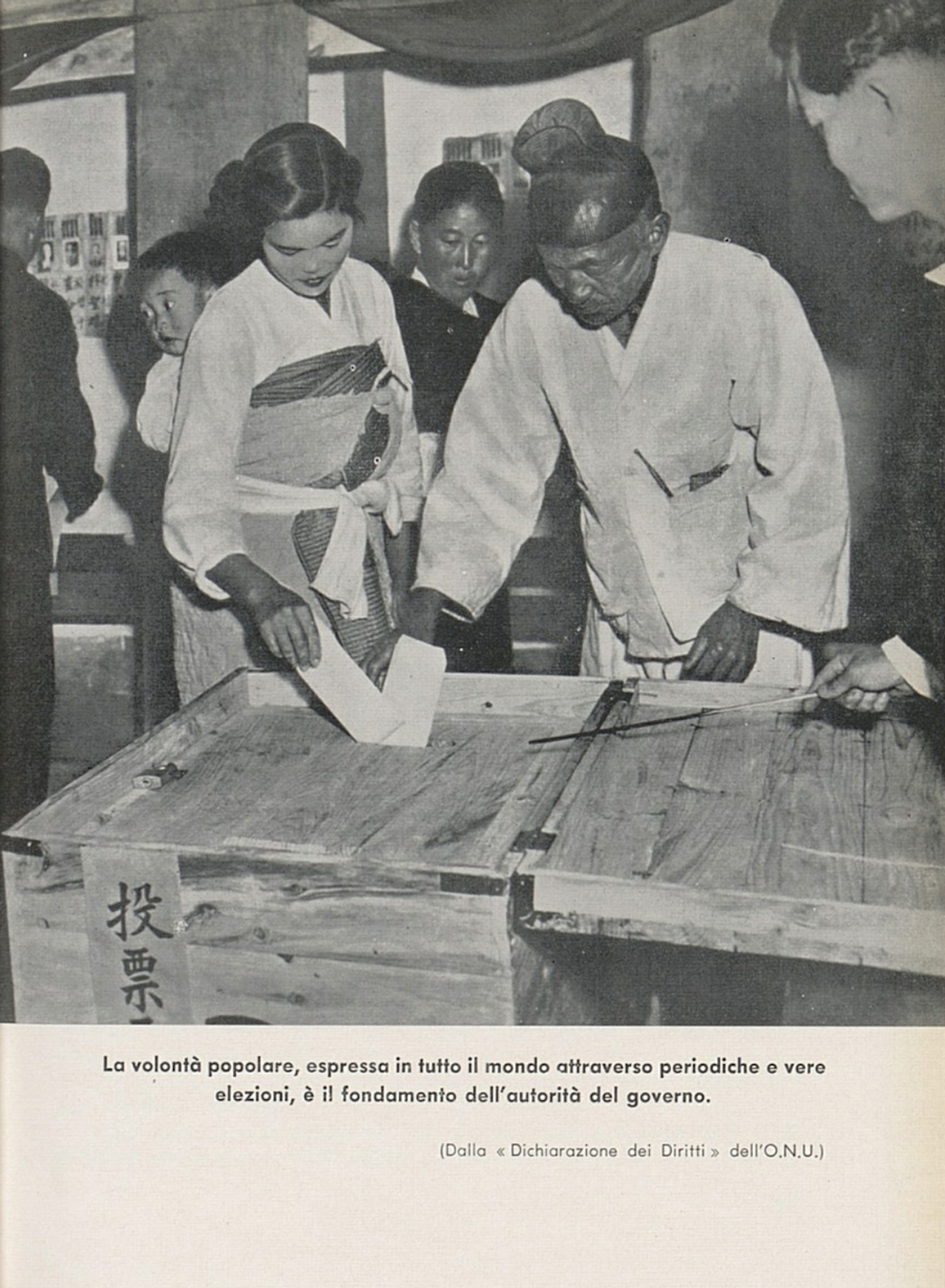 This being said, there are also notable discordant notes one can distinguish in these handbooks. Some of them – e.g., Educazione civica per le scuole medie e di avviamento, Serafino Maiolo, 1958 – are squarely focused on Italian society and most mentions of other societies and cultures seem rather perfunctory or are uninformative if not downright misleading in their simplicity (see, e.g., the division of humankind into races on pp. 39-40). They tend to present fairly short, schematic overviews of the principles of international cooperation (pp. 153-158 in the same handbook).