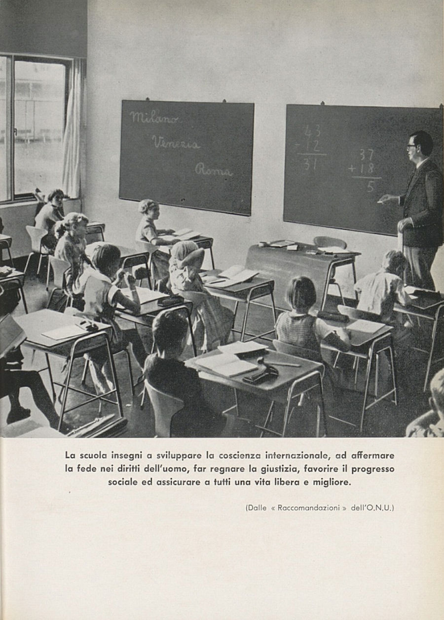 The handbooks of and introductions to topics such as civic education have been, expectedly, a staple of Italian education over the past century or so, but certain periods saw a particular abundance of such textbooks and implicitly of approaches and pedagogical methods. Handbooks of civic education proliferated around the late 1950s and early 1960s, a fascinating period to anyone interested in the history of national curricula, as the world was trying then to put behind it the devastation of World War II and the moral and political turmoil it had entailed. A general feature of these books, including the five selected here (out of about two dozen examples available in our digital archive) is the optimistic note they strike and the confidence with which they envision a world dominated by cooperation and mutual interests.