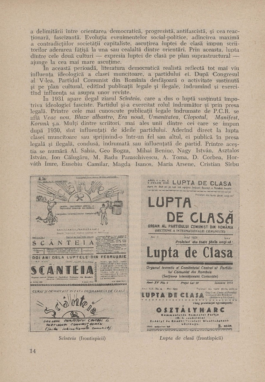 This ideological polarity forces the student to reconsider through a political lens virtually all the literary merits of the Romanian writers, not just belonging to the post-war period, but also of those authors who came to prominence before World War II. To make this distortion easier to accept, the authors of this textbook deal at some length with periodicals which had more to do with the rise of the communist movement and less with literature in the 1920s and 1930, including publications with telling titles such as Scânteia (The Spark, which would later become the main newspaper and the most effective mouthpiece of the RCP), Bluze Albastre (Blue Shirts), Lupta de Clasā (Class Struggle) and Veac Nou (New Era). The intended point is that some members of the Romanian intelligentsia between WW I and WW II published in some of those periodicals, and that provides the key to evaluating their literary works; a rather flimsy connection at best. Discussing those journals and newspapers in this context generates the illusion that the worth of a nation’s literature and literary language is indissolubly linked with politics. That is, with the political demands of a communist movement apparently invested in the prosperity of an entire nation, but in fact interested mostly in its self-perpetuation and self-promotion.