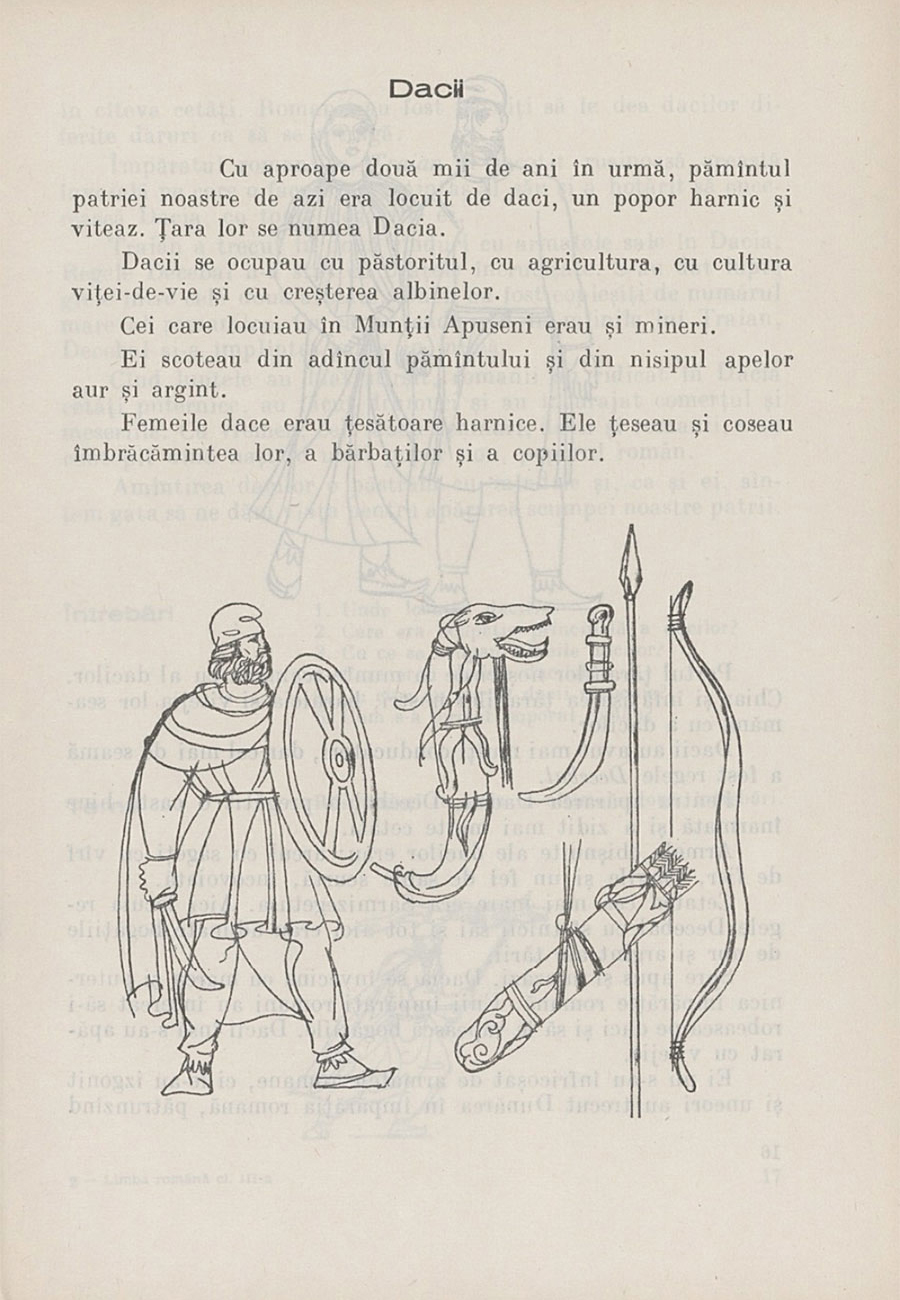 It’s also noteworthy that the communist regime did its best to muster more than just a few decades of history in its attempt to redefine the Romanian national identity. History textbooks as well as Romanian language textbooks vouch for that. In Berca et al. (1968), for example, one of the stories told for the sake of improving reading skills in elementary schools extols the glory of the ancient Dacian people. One might think that glorifying the Romans would be a more sensible way to emphasize the nature of Romanian, a Romance language, but the communist regime, especially since 1965 (under N. Ceausescu), was keen on reinventing the Romanian cultural DNA, so to speak, and to promote a particular type of nationalism and autochthonous identity by stressing the richness of the Thracian / Dacian substrate (incidentally, only a handful of words presumed to be Dacian survive in Romanian). Medieval history too is put to work in a similar way, with the selection of passages from major Romanian authors (e.g., M. Eminescu, deemed Romania’s ‘national poet’) which praise the exploits of Romanian princes or ‘voivodes’ in their struggle against the Ottoman invasion. All of those historical episodes, however, point to ideals cherished by the communists in power – e.g., self-determination, keeping a proper distance both from Moscow and from the West etc. – and help to mix a strange cocktail of national and ideological values in an effort to refashion Romania’s national identity through the education of current and future generations.