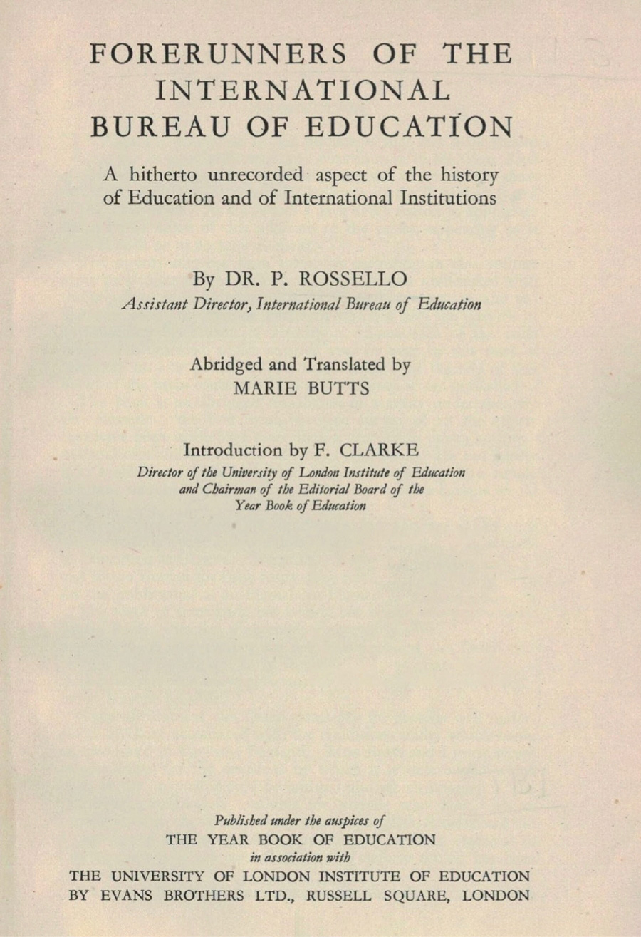 Like many histories of comparative education, Pedro Rossello, the Assistant Director of the IBE, begins his account of the development of the field with Marc Antoine Jullien of Paris and discusses the work of eight men and the activities of the League of Nations. He does, however, highlight the involvement of the American Dr Fannie Fern Andrews with the International Conference on Education convened for 1914. Fannie Fern Andrews was a keen supporter of the IBE.