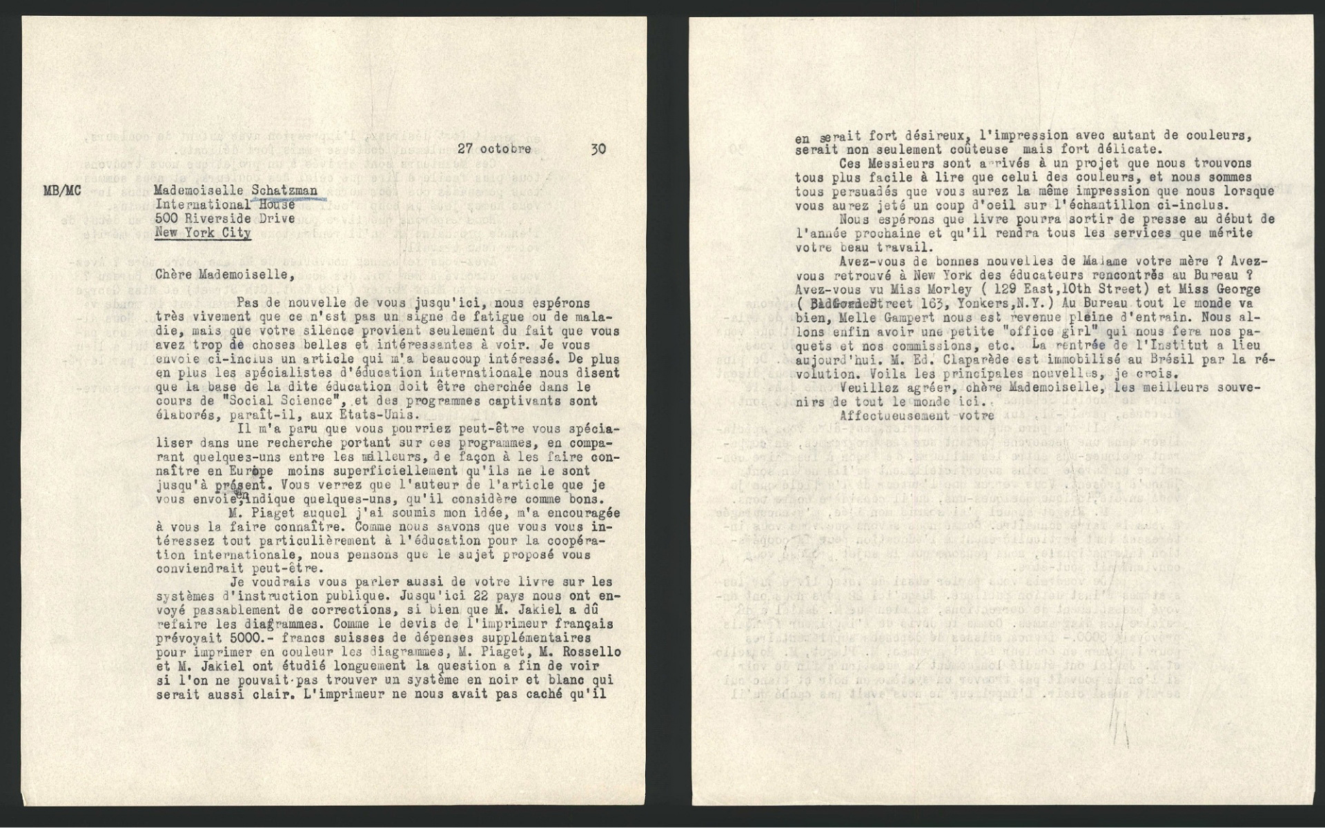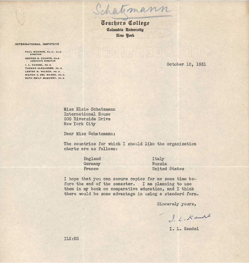 Elsie Schatzmann had written earlier to Marie Butts (on 9 March 1931) that Isaac Kandel thought that the diagrams in L’organisation de l’instruction publique dans 53 pays should have appeared in colour and that he regretted that he had not been around to raise funds for the publication of her book. He had also told her that he believed that L’organisation de l’instruction publique dans 53 pays would be in much demand.