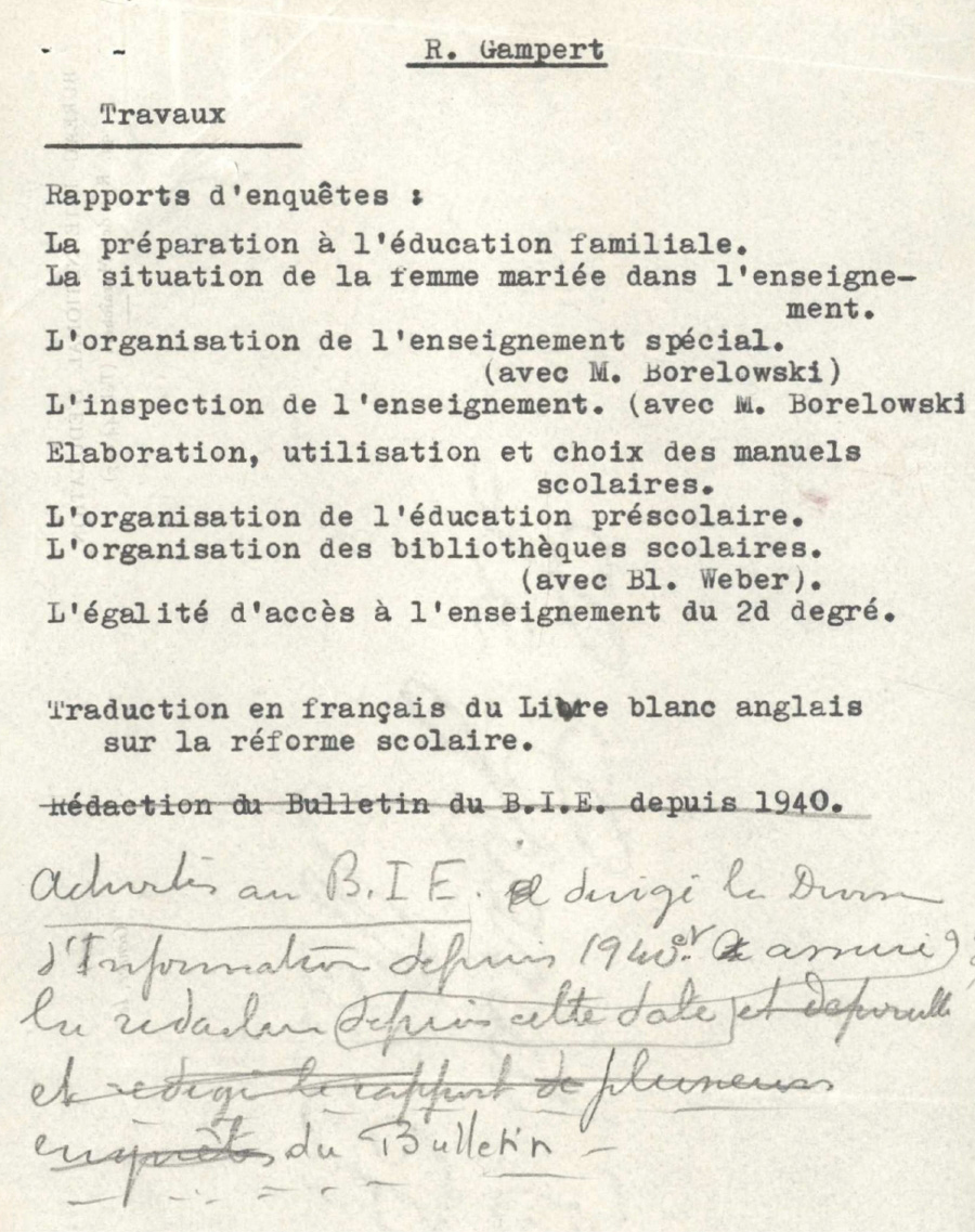 Rachel Gampert held a diploma in Educational Sciences from the University of Geneva. Prior to joining the IBE in 1926 she worked as secretary to the British Chamber of Commerce in Lausanne and had also spent a period of apprenticeship at the regional library in Lausanne. She was employed full-time at the IBE until 1948 and spent two study periods in England during this time.