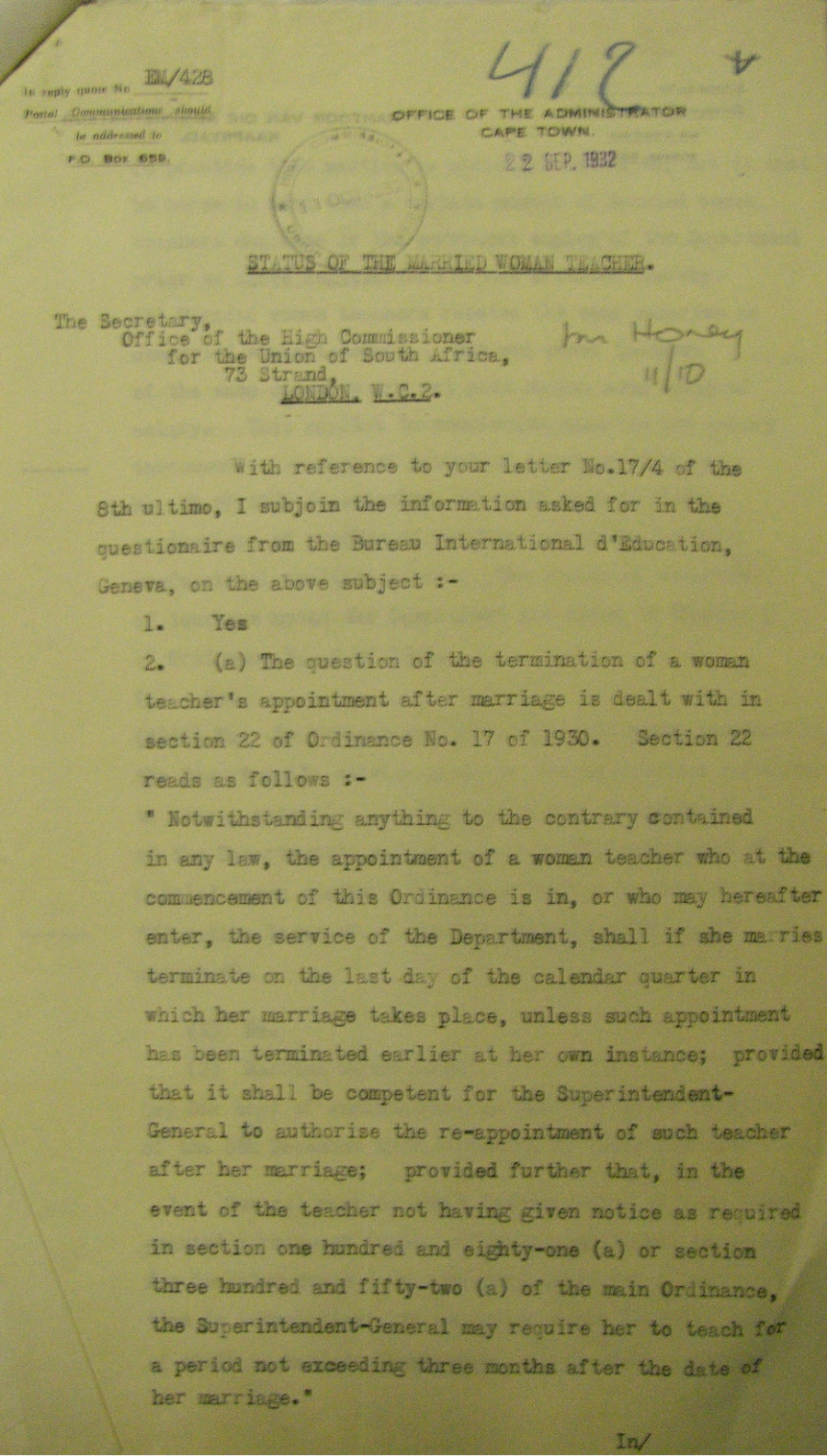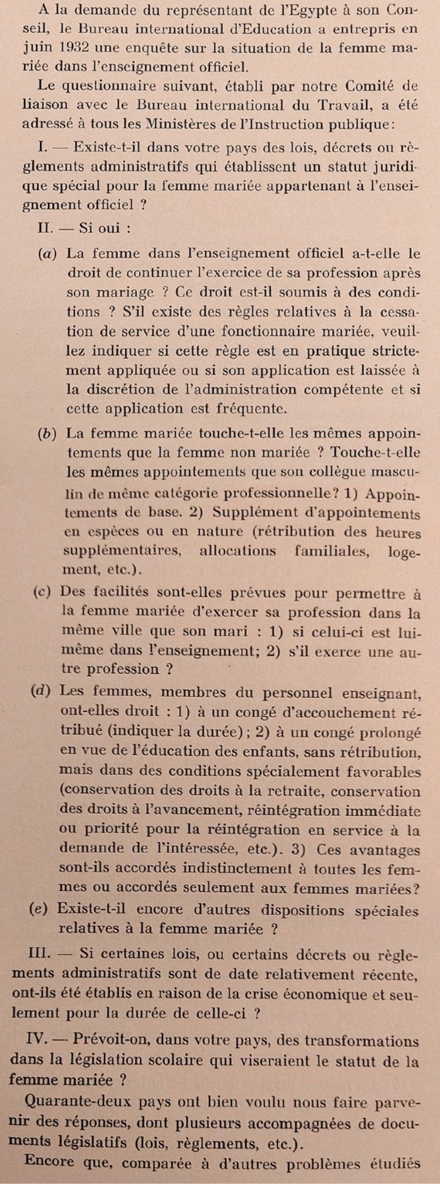 La situation de la femma mariée dans l’enseignement covered 42 countries. It was compiled against a background in which the economic constraints of the 1930s were being disproportionately applied to married women and linked in many countries with a conservative postwar vision that called on women to leave paid labour to men and to return to home and motherhood.