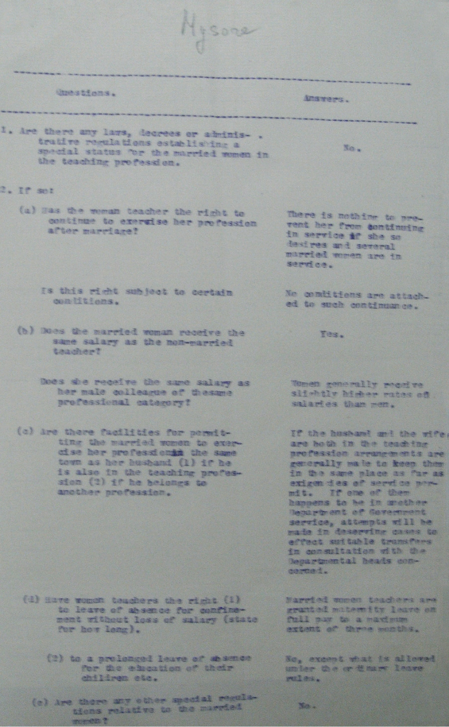 Responses to the questionnaire were submitted in various formats. Some were typed and, like the response from Mysore in India, some were returned in a tabulated format.