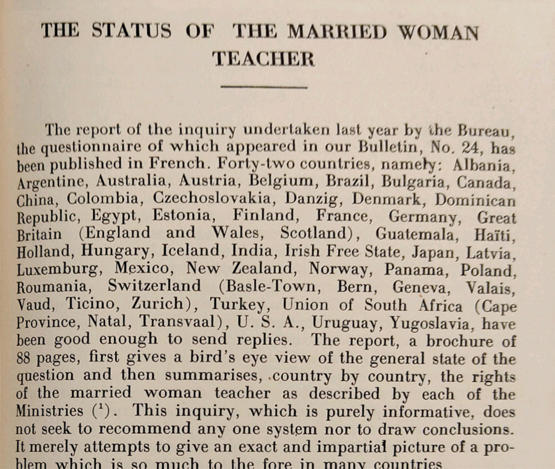 IBE Bulletin number 28 (1933) noted that the report on La situation de la femma mariée dans l’enseignement ran to 88 pages and contained a “bird’s eye view of the general state of the question” and “general summaries of the rights of the married woman teacher as described by each ministry of education”. It described the report as “purely informative” and stated that it did “not seek to recommend any one system, nor to draw conclusions. It merely attempts to give an exact and impartial picture of a problem which is so much to the fore in many countries.” This was consistent with the IBE Constitution, which stated that educational data would be collected to facilitate the exchange of information so that each country could profit by the experience of others.